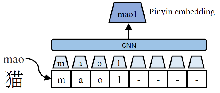在汉语拼音中,在建模语义和语法信息方面起着至关重要的作用;这些信息无法从上下文或字形嵌入中获得;同一个汉字可能会有不同的意义;例如,“乐”这个声母既可以指代快乐的情感状态;汉语拼音能够帮助识别每个汉字的词性;同时需要注意的是;字形嵌入与字符标识嵌入虽然都直接指向同一字符标识符;但并不包含任何发音方面的信息;