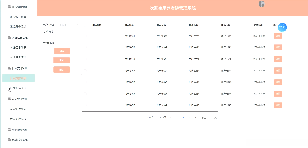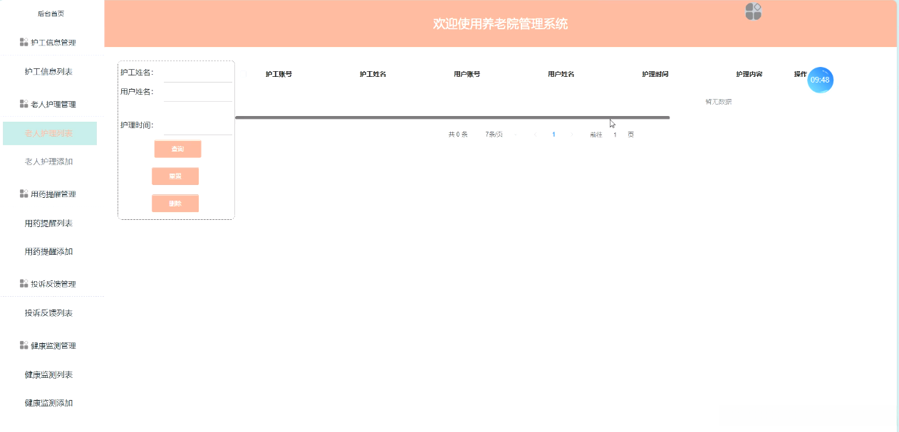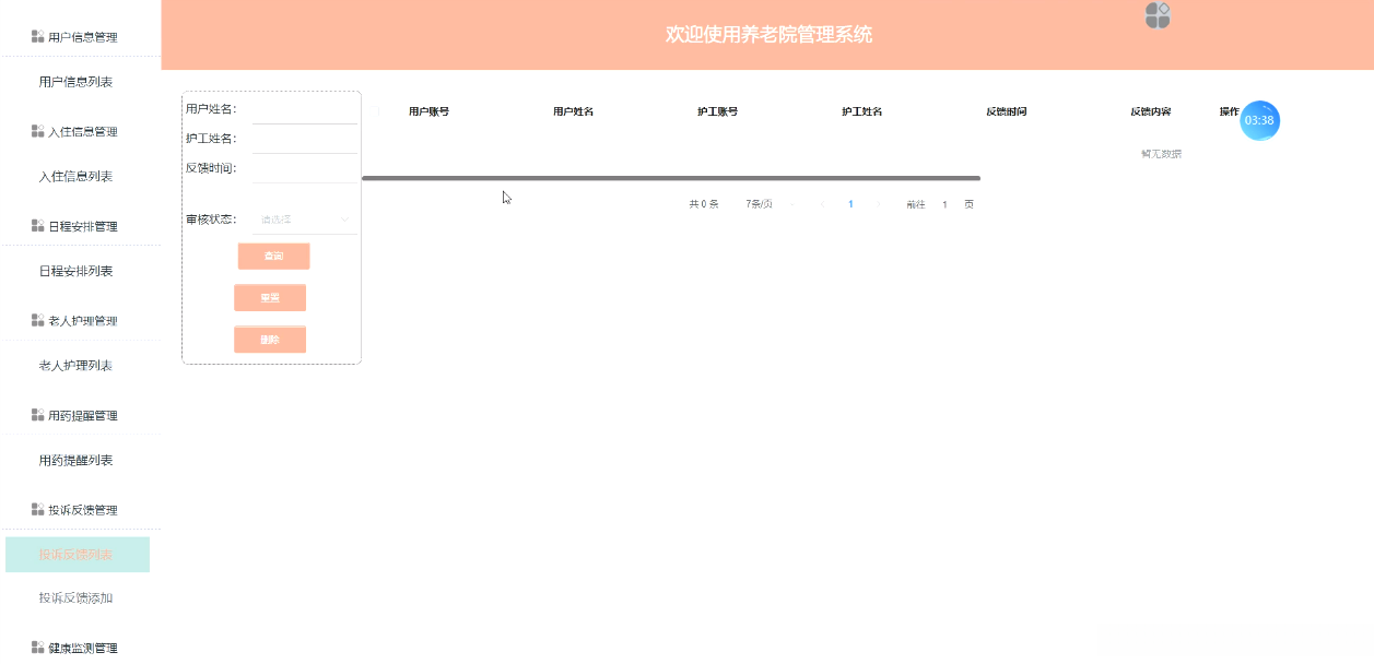 3、该系统具有完善的功能,包括管理首页、系统用户(管理员、注册用户、护工用户)、用户信息管理、护工信息管理、房间编号管理、床位编号管理、入住信息管理、日程安排管理、用户护理管理、用药提醒管理。投诉反馈管理、健康监测管理等。此外,还提供了维护和更新模块的功能。