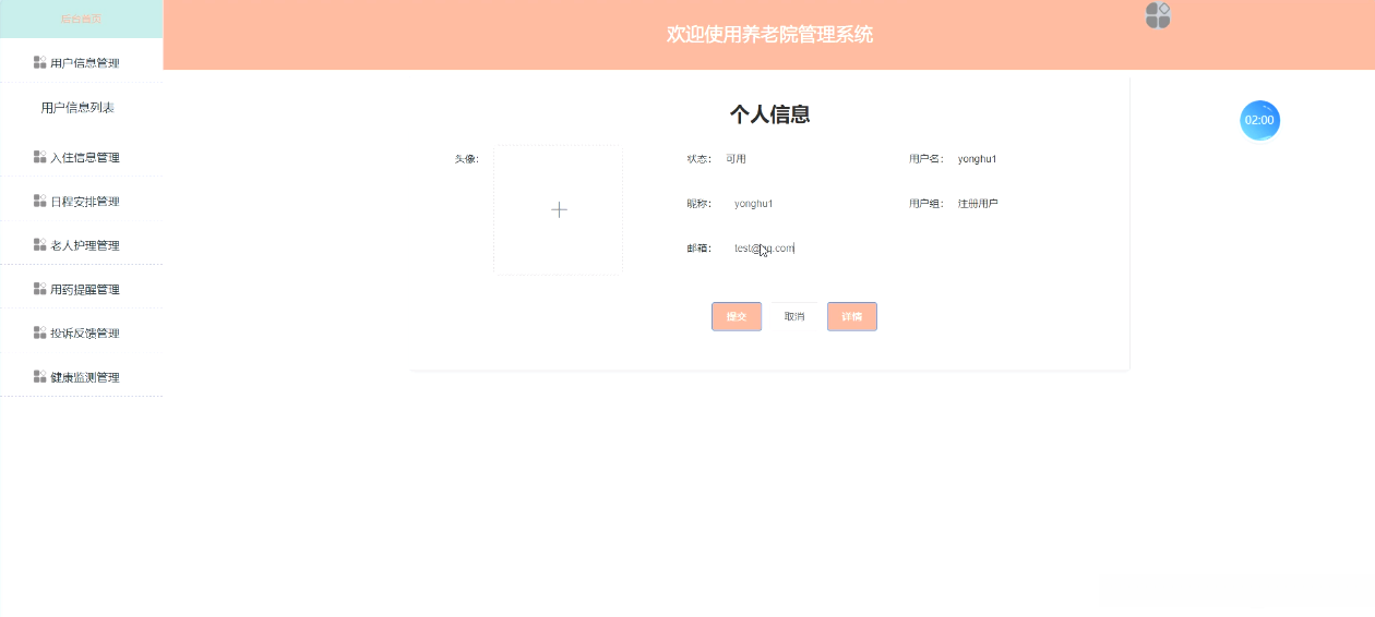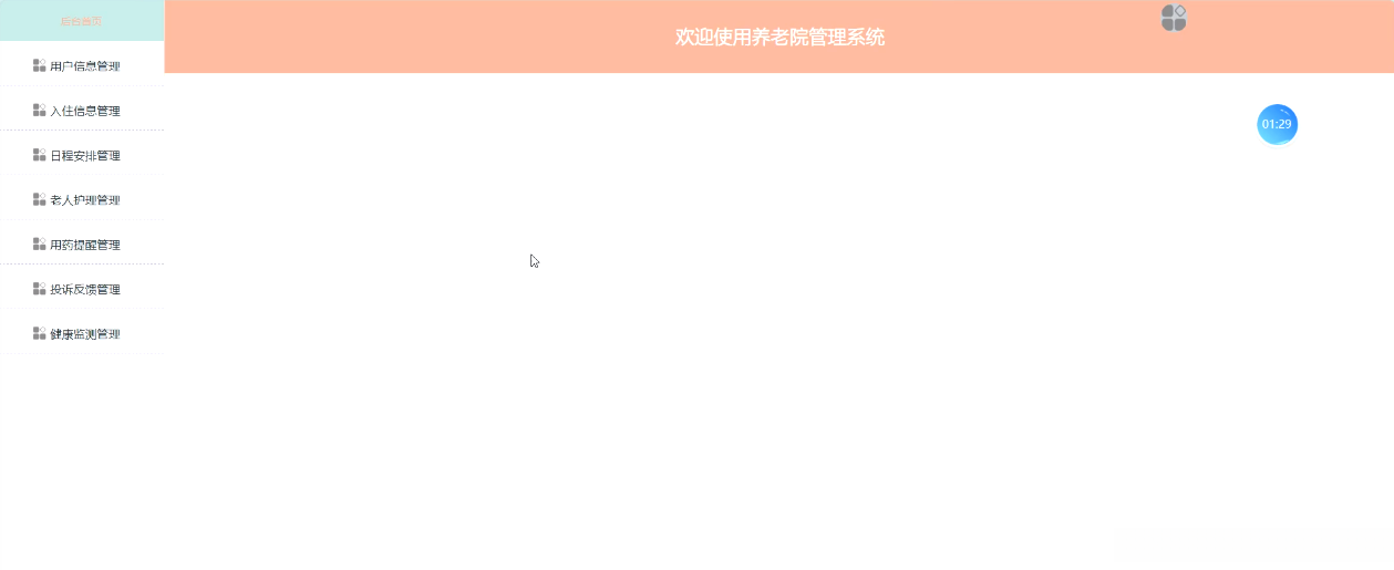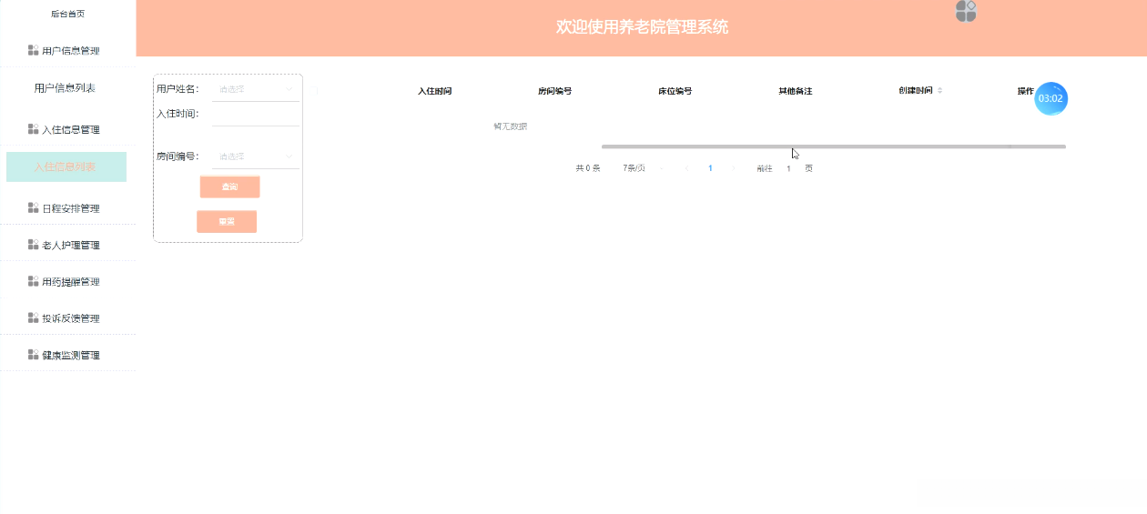 用户通过登录后台,查看首页、用户信息管理、入住信息管理、日程安排管理、老人护理管理、用药提醒管理、投诉反馈管理、健康监测管理等详细信息,如图5-7所示,以便更好地了解自身的情况。