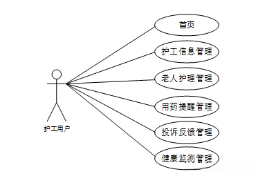 护工用户主要功能:首页、护工信息管理、老人护理管理、用药提醒管理、投诉反馈管理、健康监测管理等,护工用例如图3-6所示。