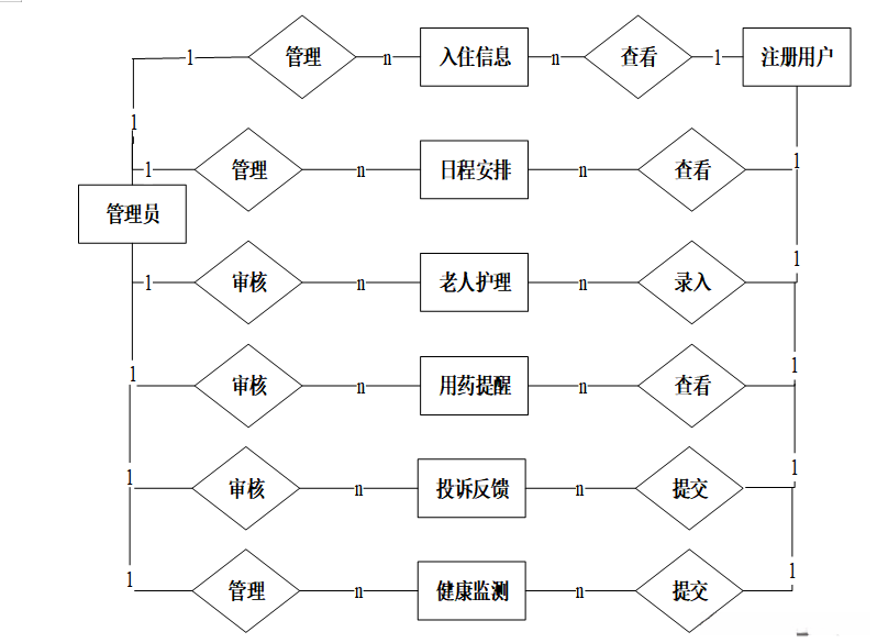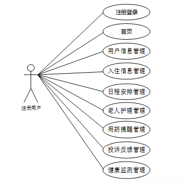 注册用户主要功能:首页、用户信息管理、入住信息管理、日程安排管理、用户护理管理、用药提醒管理、投诉反馈管理、健康监测管理等,用户用例如图3-4所示。