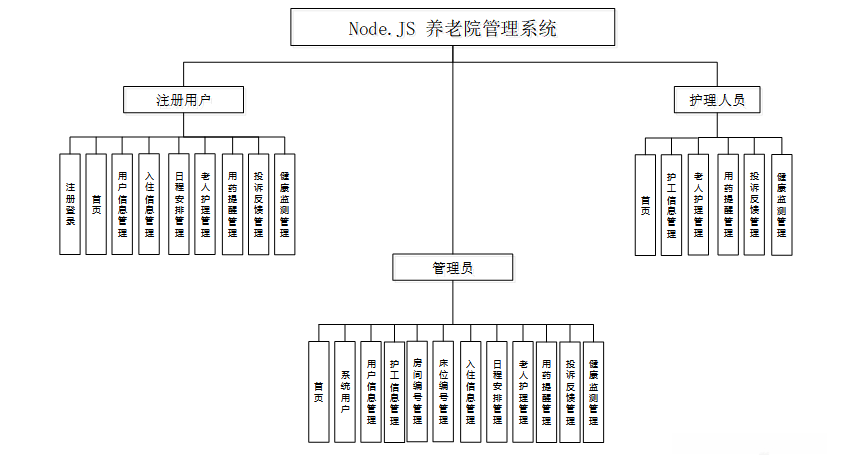 按照Node.JS 养老院管理系统的角色,我划分为了注册用户模块、护工用户模块和管理员模块。