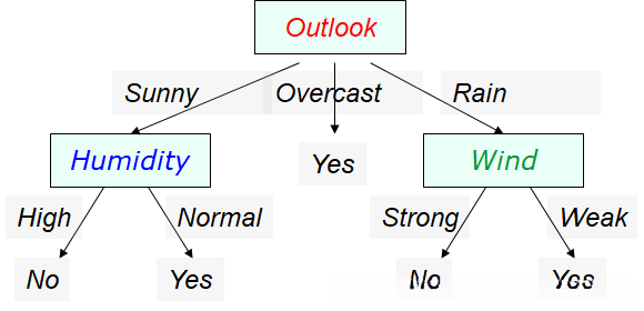 按熵减的大小对天气属性进行决策树的构建,得到以下决策树: