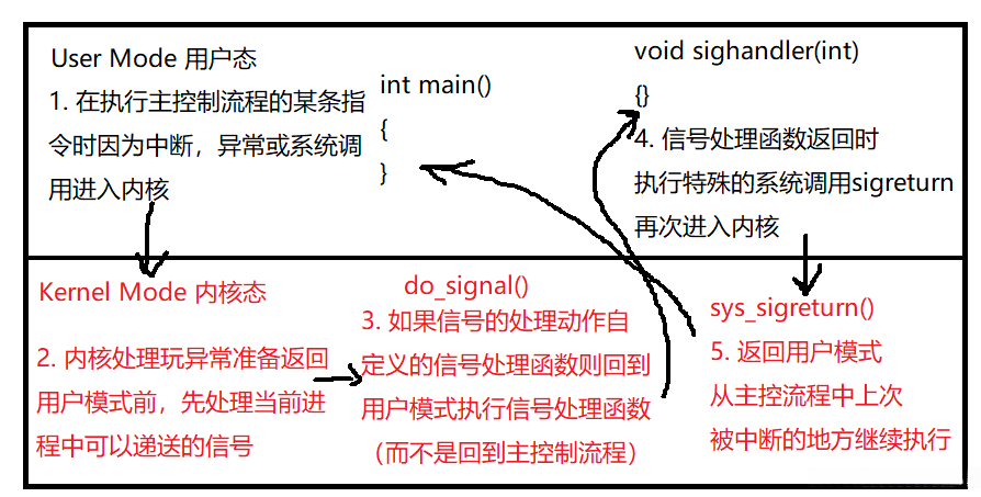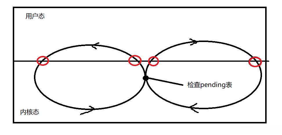 如上图的一个横着的 ‘8’,用户态和内核态每个循环会切换四次,同时注意检查pending表未决信号是在内核态进行的。