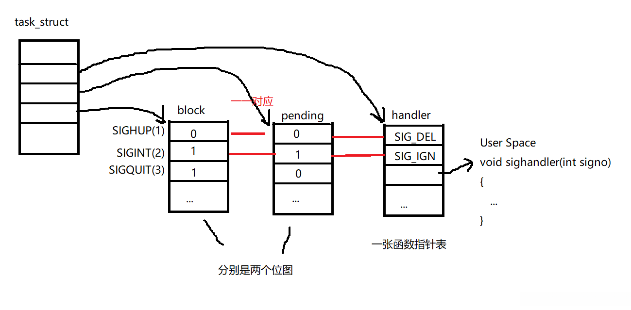 每个信号都有两个标志位分别表示阻塞(block)和未决(pending),还有⼀个函数指针表示处理动作。 信号产生时,内核在进程控制块中设置该信号的未决标志,直到信号递达才清除该标志 。在上