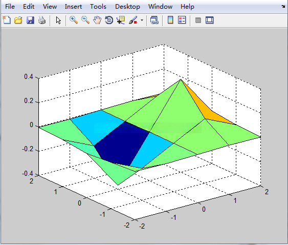 为了获得这个区域内的数据分布情况,在编程实现时我们选取了x和y两个方向上的等间隔采样点,并将这些采样点依次计算对应的z值以构建空间曲面的数据矩阵。具体来说,在x轴方向上取样点为-2,-1,0,1,2,在y轴方向上同样取样点为-2,-1,0,1,2。通过计算这些离散点处的函数值得到一个完整的二维数组即为z矩阵数据。因此我们获得了一个矩阵形式的z值数据集从而我们可以轻松地绘制出曲面图形。