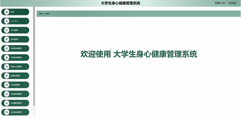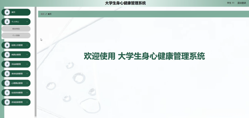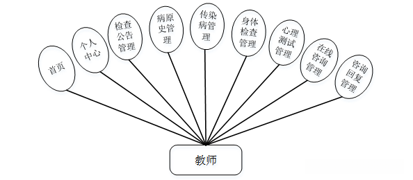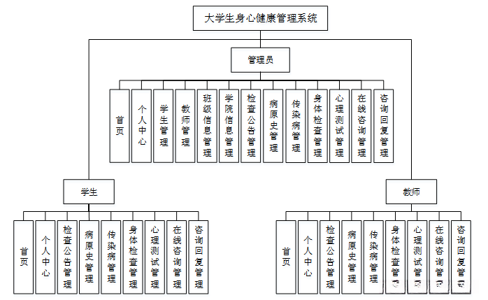 本系统的用户可分为主要分为学生以及教师与管理员三个主要用户角色构成。其中管理员能够对系统内的所有功能进行有效管理和控制主要包括首页, 个人中心, 学生/教师/管理员..., 在线咨询/咨询回复..., 咨询回复等功能;而学生仅能访问首页, 个人中心, 检查公告, 病原史, 传染病, 身体检查, 心理测试, 在线咨询及咨询回复等功能;教师同样可访问上述大部分功能但需注意权限范围限制