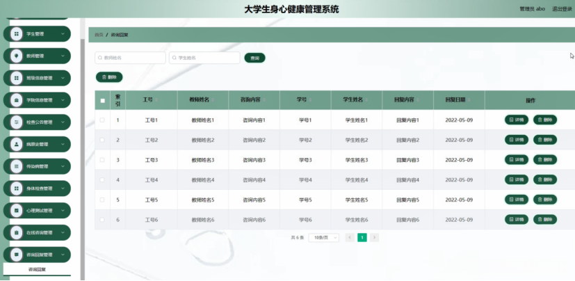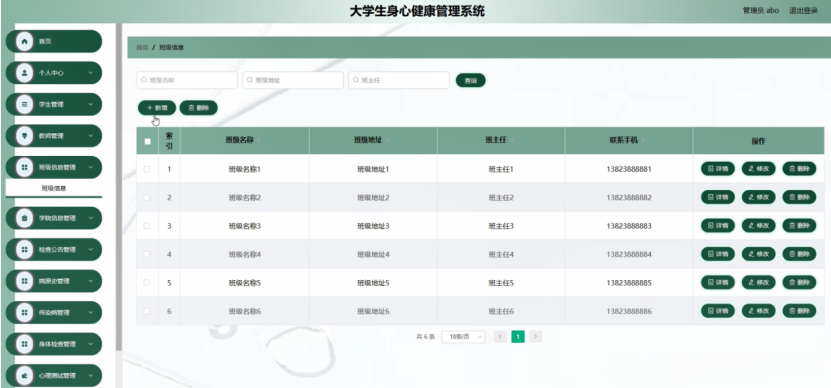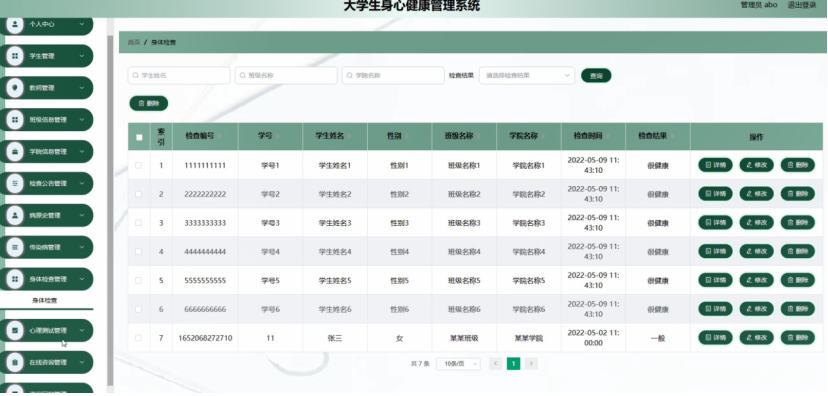 身体健康管理;在'身体检查管理'页面中可对索引字段、编号字段、学号字段、学生姓名字段、性别字段、班级名称字段、学院名称字段、提交时间以及健康评估结果等信息进行详情查看、修改或删除操作(如图5-9所示)。