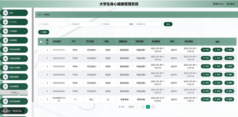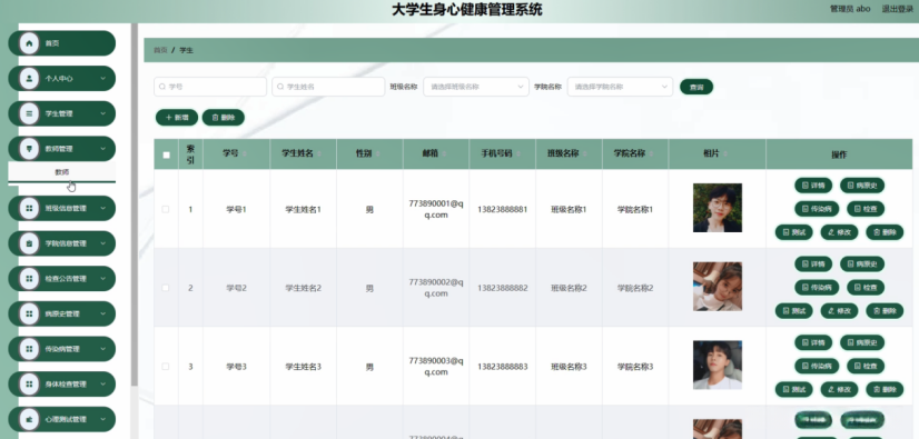 在学生成绩管理系统中提供一个直观的学生信息管理界面,在该界面中可实现索引字段、学号、学生姓名、性别、邮箱地址、手机号码、班级名称以及学院名称等多个详细信息的查看记录(详情)、病史记录、健康评估结果(传染病)、健康检查记录以及可执行的学生数据修改操作和删除操作(如图5-4所示)。