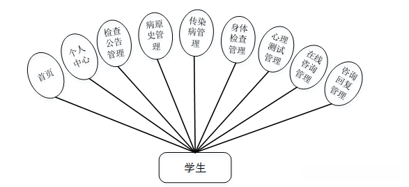(2)学生模块的主要组成部分包括首页、个人中心以及一系列功能模块如公告信息查询与更新、既往病史查询与维护、传染病疫情查询与记录等。这些功能主要用于健康数据的管理和整理,并通过在线咨询记录与存档的方式为用户提供服务支持。学生用例图如图3-2所示