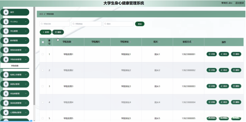 在该学院信息管理页面上可以实现对索引标识符、院系名称、院系图片、院系办公地址以及院系负责人及联系方式等内容的详细信息查询、增删改查等基本功能。如图5-7所示。