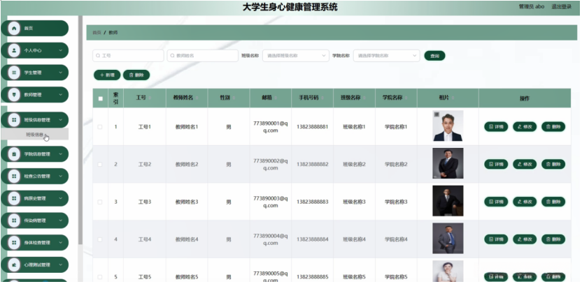 在教师管理系统中,在教师管理页面中可以对索引字段(如索引信息)、工号字段(如编号)、教师姓名字段(如姓名)、性别字段(如性别)、邮箱地址字段(如电子邮箱)、电话号码字段(如联系电话)等信息进行详情查看、修改记录或删除操作,请参考图5-5所示界面结构