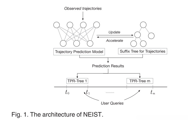 NEIST主要由三个部分组成:轨迹预测模型、轨迹后缀树索引和基于时隙的tpr树(TS-TPR)。1)它的现有轨迹被用作神经模型的输入,神经模型将生成对轨迹的预测。