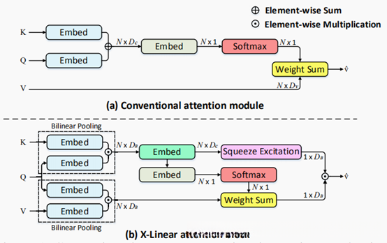 (b)X线性注意力块主要通过双线性 pool 来捕捉两阶特征间的相互作用,在空间维度上关注注意力分布,并在通道维度上聚焦于特征间的相互作用;这两个不同的 notice weights 分别用于聚合双线性 pool 在 query 向量与 value 向量上的增强信息。