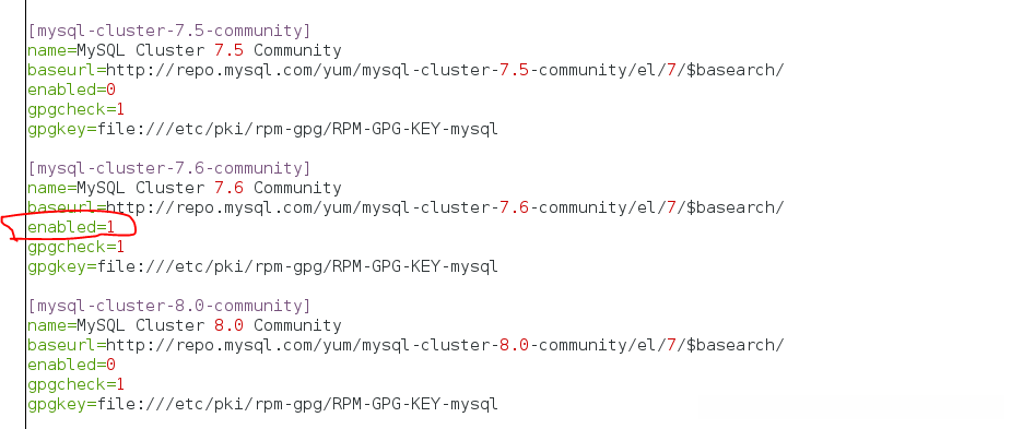3. 编辑/etc/yum.repos.d/mysql-community.repo文件,修改enable属性为1可安装对应版本