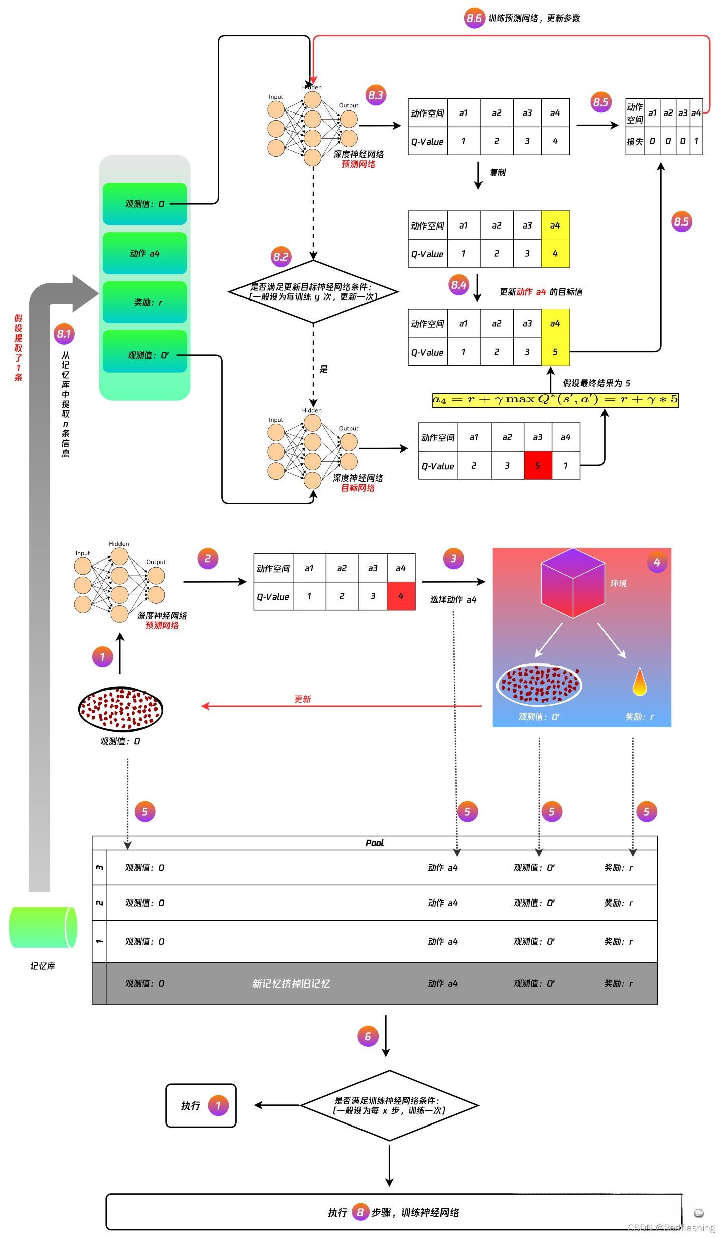 - 第三,在执行策略时当前策略决定了下一个训练数据的状态与动作。例如当最大化动作选择向左移动时则会主要从左侧的历史状态中选取数据作为训练集;如果随后选择向右移动则会切换到右侧的历史状态作为主要来源构建新的训练集。这种动态变化很容易导致反馈机制引发不希望的结果如陷入局部最优解或者出现参数爆炸的情况。通过引入经验回放机制将历史状态的数据进行平均处理以增强稳定性并避免模型在更新过程中出现振荡或发散的问题 。需要注意的是在采用经验回放的情况下必须进行策略外的行为学习(因为当前策略与生成数据所使用的策略存在差异)这也正是Q-learning算法得以应用的原因。