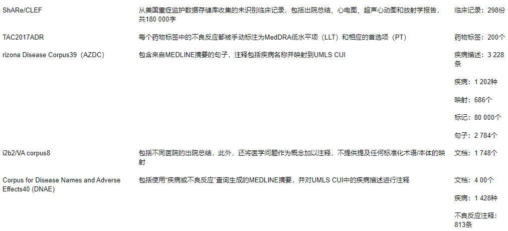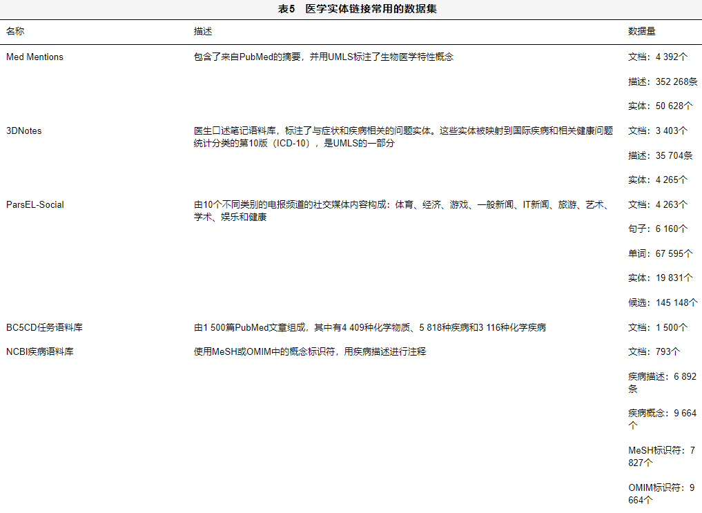 医学实体链接较常用的数据集主要有以下几种,见表5。