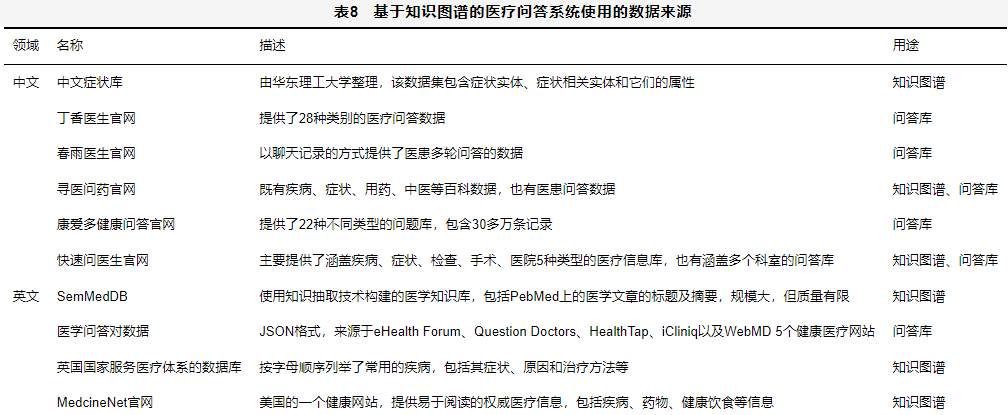 本文参考了近3年的研究进展,总结出医疗领域基于知识图谱的问答系统主要有两种实现方法:检索式和生成式。其中,检索式主要面向系统构建的知识图谱,生成式主要面向系统收集的问答库数据,表8列出了可用于构建基于知识图谱的医疗问答系统的数据来源。