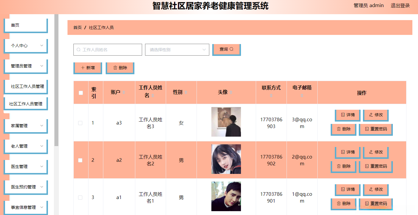 如图5.2显示的就是社区工作人员管理页面,此页面提供给管理员的功能有:查看已发布的社区工作人员数据,修改社区工作人员,社区工作人员作废,即可删除,还进行了对社区工作人员名称的模糊查询 社区工作人员信息的类型查询等等一些条件。