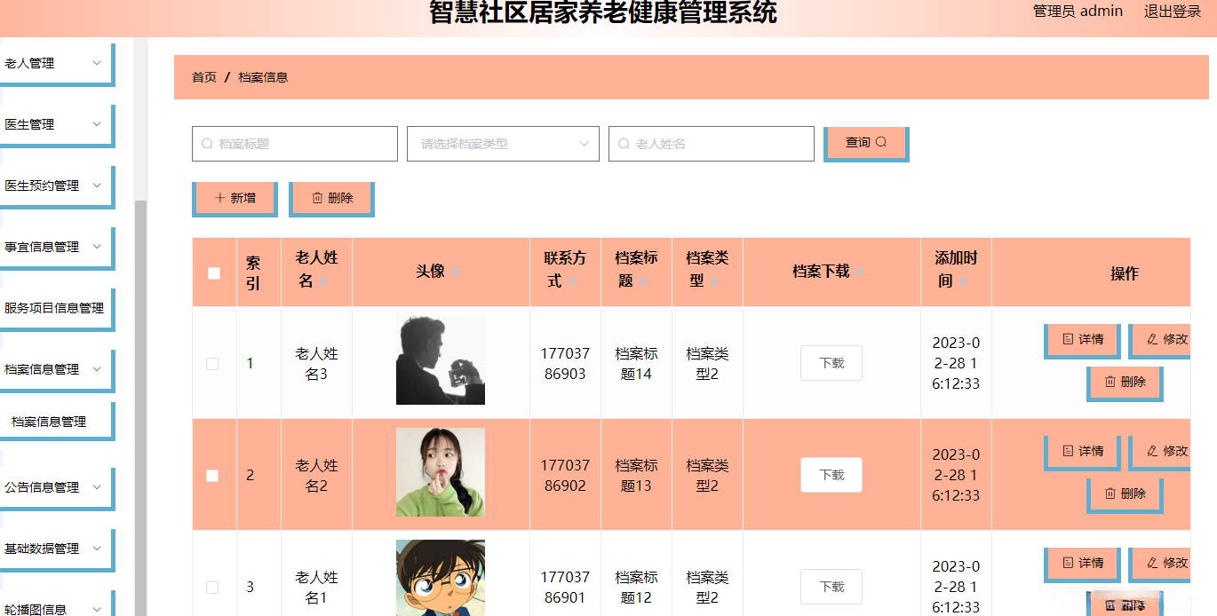 如图5.1显示的就是老人信息管理页面,此页面提供给管理员的功能有:老人信息的查询管理,可以删除老人信息、修改老人信息、新增老人信息,