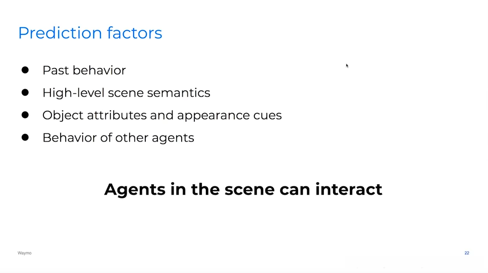 预测的相关因素包括过去的历史行为、复杂的场景信息以及物体特征等关键要素。在周围的事物中进行考量时会遇到各种情况:例如一辆自行车试图穿越街道时,则必须停下或放慢速度让它通过。这种情况下就需要提前规划并设计出安全可靠的解决方案。同时,在此过程中还需要向周围的参与者发出明确的信号