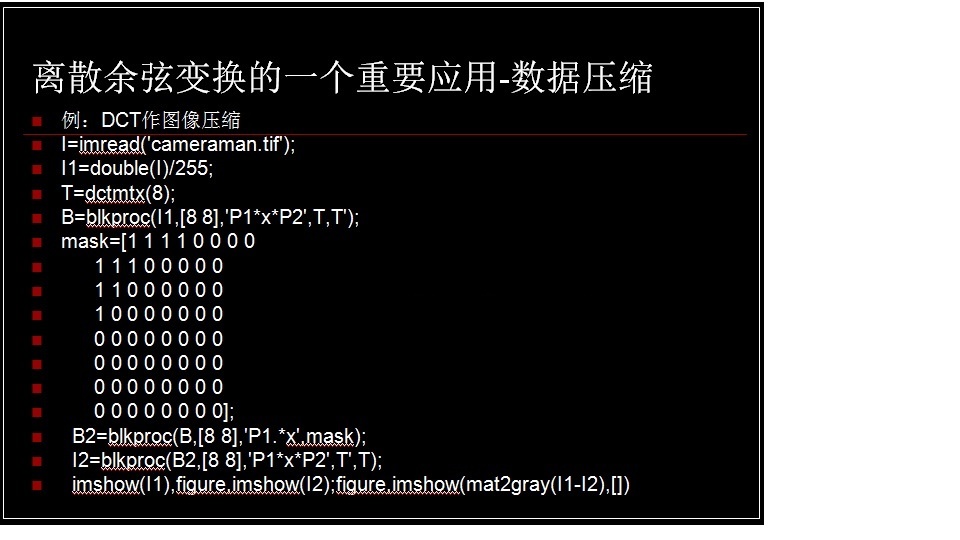 T=dctmtx(N)产生DCT变换矩阵,如果进行二维变换,B=TAT',逆变换为A=T'BT;