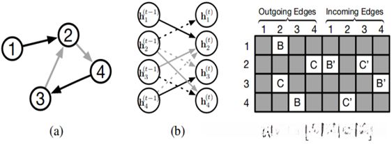 GGNN采用了门控型神经网络来处理图数据,在许多应用场景中具有显著优势。如图5所示,在GGNN架构中所采用的邻接矩阵呈现出显著的不同特征。其输入包括网络结构及其邻接矩阵,在这种设计下,默认情况下不仅沿显式连接传播信息,在反向连接方向上也会同步进行信息传递。相比于传统的GCN框架,在节点信息融合过程中,默认仅沿显式连接方向传播信息可能会导致某些节点信息被忽视。为此,在GGNN架构中,默认情况下不仅沿显式连接传播信息,在反向连接方向上也会同步进行信息传递。