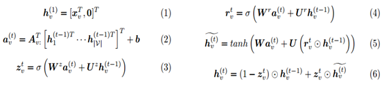 (1)我们从相邻节点中获取了潜在向量,并将它们用作图神经网络的输入。(初始向量为随机初始化的)。 (2)遗忘门与重置门负责决定是保留还是删除某些信息。(3)通过前一时刻的状态、当前的状态以及重置门生成候选状态。(4)每个节点的状态最终由前一时刻的状态与候选状态相结合构成。