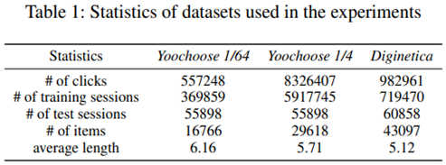 本文采用了两个数据集作为研究基础:Yoochoose源自RecSys challenge 2015,并包含了用户的点击序列;而Diginitica源自CIKM Cup 2016,则仅利用其交易相关的数据进行分析。为了保证对比的公平性,在实验过程中研究者对原始数据进行了预处理工作:去除了长度仅为1的会话记录以及出现频率低于5的项,并最终构建了如表1所示的数据集规模结构