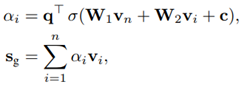 其中 q∈ R^d, W₁ 和 W₂ 分别表示两个可训练矩阵。全局向量则通过对其所对应的所有 item 向量进行加权求和的方式生成。在 session 序列预测任务中,在下一次 item 点击行为上的 session 向量预测过程通过融合全局与局部特征来实现。具体而言,