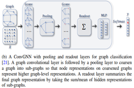 GCN 最初应用于一篇题为《Spectral networks and locally connected networks on graphs》的论文中。该论文提出了一种基于谱图神经网络的模型。然而真正推动GCN走向学术研究领域的是2016年发表的一篇名为《semi-supervised classification with graph convolutional network》的论文,在该文中作者提出了基于图卷积神经网络进行图节点分类的方法(如图3所示)。在该GCN架构中通过聚合节点及其邻居的信息来表示当前节点从而实现节点级别的分类功能。进一步在此基础上作者设计了一个POOLING操作以实现图级分类(如图3所示)[2]。每个POOLING层的作用是根据节点向量生成一个更为粗化的子图(称为聚类图)使得节点能够表示更深层次的图特征最后经过一个softmax线性层输出每个图对应的标签类别。(参考文献[2]或上一篇博客[3])