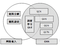 GNN是一种深度学习模型,在解决图相关任务时采用端到端的方式,并最大限度地提取深层次表示信息;而网络嵌入则主要是在低维向量空间中进行管理与操作,并同时保留网络的拓扑结构和节点内容信息;这些低维表示不仅可以用于多种 downstream任务(如图分类、节点聚类等),还体现了二阶段式的算法设计特点;根据图2所示([1]),目前已有系统性的工作对现有方法进行了全面梳理:左边是基于范畴化的分类方法总结(Categorization-based),右边则是从文献研究的角度进行了系统综述(Research-oriented)。目前主流的研究工作主要聚焦于无监督的学习框架:即矩阵分解、随机游走以及自编码器这三大类方法构成了当前研究的主要内容;其中基于深度学习的方法——生成对抗网络(Generative Adversarial Network)属于这一领域的主要代表技术