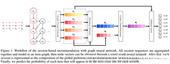 为了解决上述两类局限性问题,我们提出了一种名为SR-GNN的推荐框架。该框架主要由四个主要模块构成,并专注于实现会话序列的个性化推荐。其中大部分内容来源于作者对相关博客[4]和[5]内容的学习与总结。