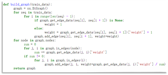 每个session序列中的item都基于其点击时间被建模为有向图,在这种模型中,每个节点代表一个特定的item,并且每条边反映了用户的行为模式。这意味着不同session中出现的同一个item同样可以在这种结构中得到体现。然而,在一个有向图中同一个节点(即同一个item)可能会多次出现以反映其在不同session中的活动情况。为此提出了新的矩阵构建方法来解决这一问题,并在下文中给出代码示例