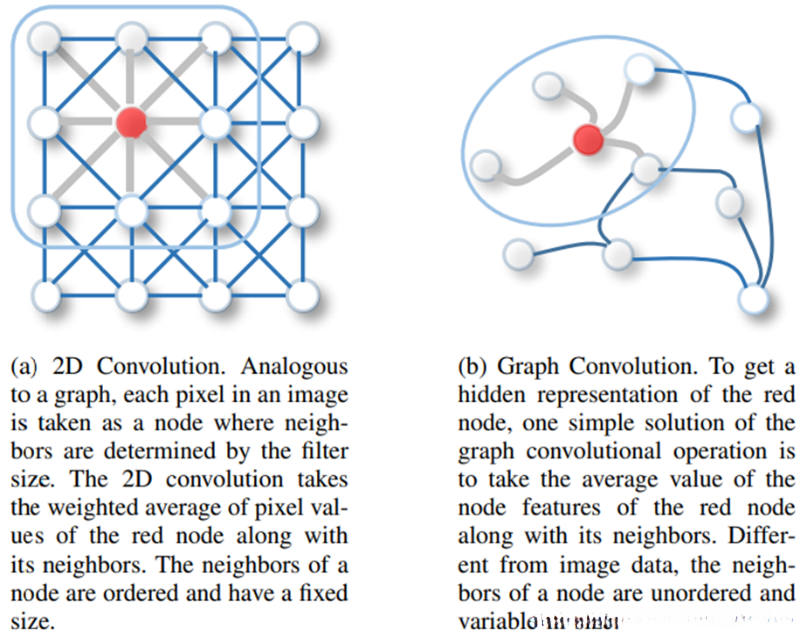 但是已有诸多领域实证显示CNN、RNN等模型确实具有显著性能优势,并因此在将深度学习模型迁移到图数据这一领域时提出了多种基于图结构的神经网络模型。其主要动因在于将传统的2D卷积操作(如上图左侧所示)扩展至适用于非欧几里得结构的数据(如上图右侧所示)。值得注意的是,在图像处理中,默认情况下每个像素节点周围的邻居数量及连接方式通常由一个n×n的滤波器矩阵来定义。然而,在图像处理中,默认情况下每个像素节点选择其邻居的方式通常基于固定的大小和顺序,并且这种选择会带来一定的约束性。值得注意的是,在图形数据中这种约束性并不存在——相反地,在图形数据中的每个节点邻居的选择往往呈现出高度动态性和无序性特征。