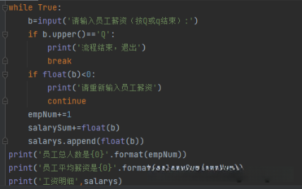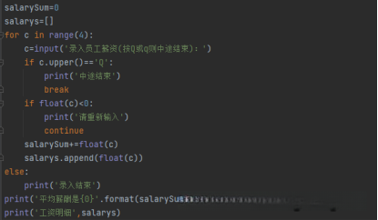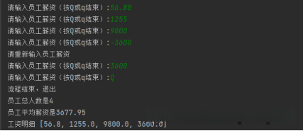 练习题:共有四名员工。录入这四人的薪资信息,在所有信息完整后,请打印并显示提示信息"您已成功录入全部四位员工的薪资"。最后一步,请计算并输出每位员工的工资总额以及全体人员的平均工资。