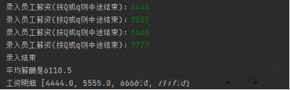 录入员工的薪资信息。如果录入的薪资数据为负值,则需要重新录入数据。最后系统会输出录入的员工数量以及详细的薪资信息列表,并计算并显示所有录入员工的平均薪资