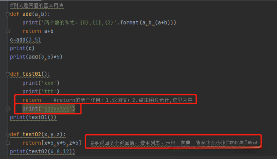 (3)要返回多个返回值,使用列表、元组、字典、集合将多个值“存起来”即可。
