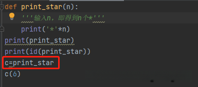 通过观察发现变量c和print_star都共享相同的函数指针。这意味着调用c(3)与调用print_star(3)的结果将完全一致。在Python编程语言中,默认情况下使用圆括号来指示对函数的调用。如果未使用圆括号,则Python将处理该函数作为普通的对象。