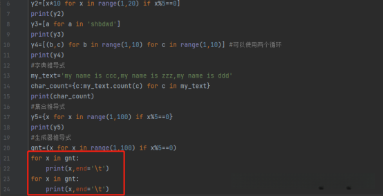 元组不是推导式,在Python中使用(x for x in range(1,100) if x%9==0)时会生成一个生成器对象;每次只能运行一次该生成器对象,在第一次迭代时能够获取数据,在后续的任何一次迭代时均没有数据可获取: