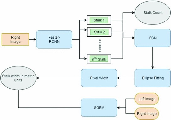 Baweja H S等人提出StalkNet,该方法利用深度学习方法获得植物秸秆数及茎宽[17]。StalkNet使用Faster RCNN进行物体检测并对检测结果进行计数,该计数结果即为该植物的秸秆数。StalkNet以物体检测结果作为全连接网络的输入,输出为植物秸秆的像素宽度,通过立体视觉匹配将像素宽度转换成植物秸秆的实际茎宽。