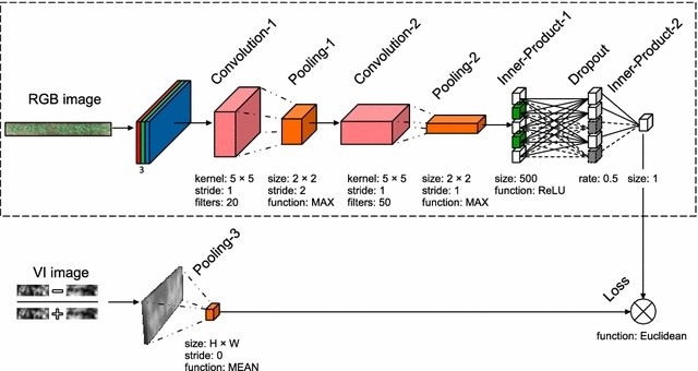 在深度学习时代,卷积神经网络被广泛用于物体分类等领域,经典的网络结构包含卷积层、池化层、随机失活层、非线性激活函数等。Khan Z等人提出了一种使用RGB彩色图像进行基于模型的植被指数估计的新方法[15],在保留卷积层、池化层等卷积神经网络常规结构的基础上通过更换新的损失函数,实现对植被指数的估计。整个实验以RGB图像作为输入,输出结果为对应的植被指数,进而获取RGB图像所对应区域的作物健康状况、水分含量、营养含量等信息,具体结构如图7所示。