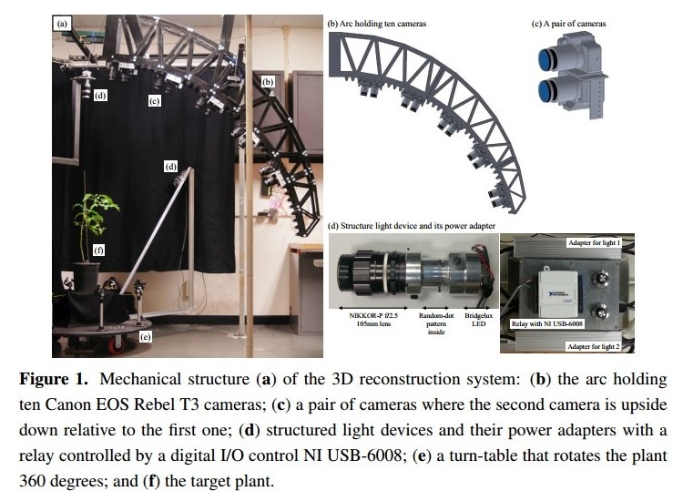 Nguyen T T等人构建了基于结构光的植物三维重建系统[18],如图10所示。该系统包括若干双目相机、结构光装置、可旋转平台等。该系统使用相机阵列获取图像,使用GPU完成匹配,生成点云并对植物进行三维重建。