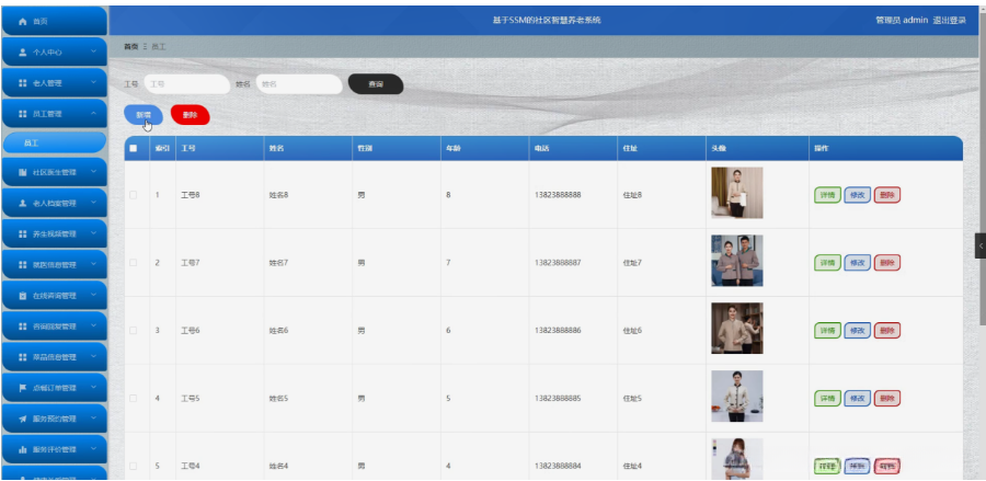 系统管理员点击进入老人管理界面。系统管理员在老人信息页面输入相关数据后,在线完成查询、新增或删除操作,并根据实际需求完成对相关数据的查看、修改或彻底删除操作;如图5-11所示: