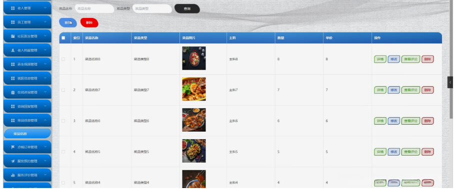 系统管理员点击进入菜单管理界面,在菜单设置中选择"菜品管理"选项后打开"菜品信息"页面,在此页面中依次输入菜品名称以及所属类别编号的信息完成查询筛选工作;根据具体需求完成查看详细资料、编辑修改内容以及记录更新等操作任务;当需要时可执行创建新条目或删除已存在的条目功能;请参见图5-14以获取更多操作指导