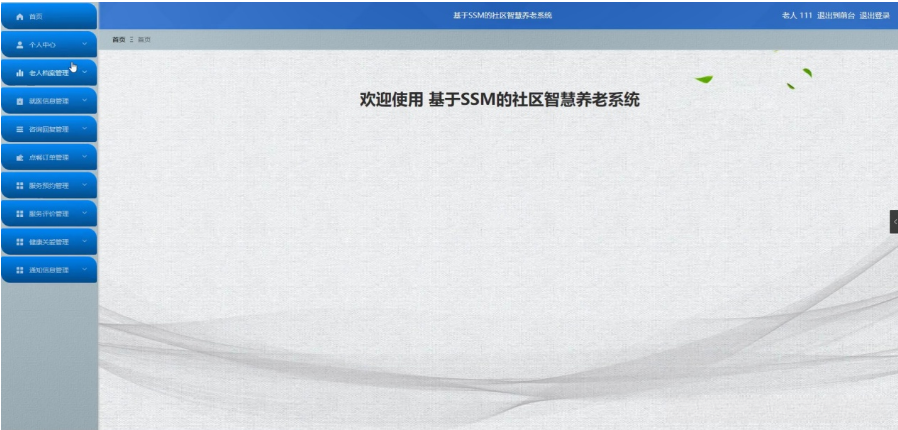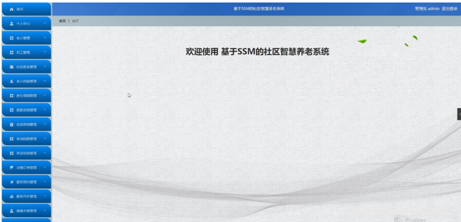 管理员登录后进入主页面界面,在线完成相应的操作流程。该系统为每位用户提供了以下核心功能模块:个人中心信息管理、家庭成员基础信息维护、员工档案详细管理、社区医疗资源查询、健康档案电子存档、养生视频点播服务、就医记录查询系统、在线咨询记录整理、医疗咨询响应记录存档以及膳食搭配建议服务等特色功能区。
