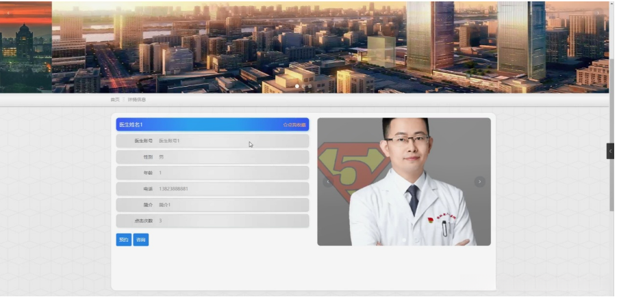 社区医疗服务中心:在社区医疗服务中心页面的录入区录入医生账号及姓名后完成检索。该页面方便了解各类详细信息,并支持预约登记、沟通交流、反馈意见或记录个人关注事项;如图5-3所示: