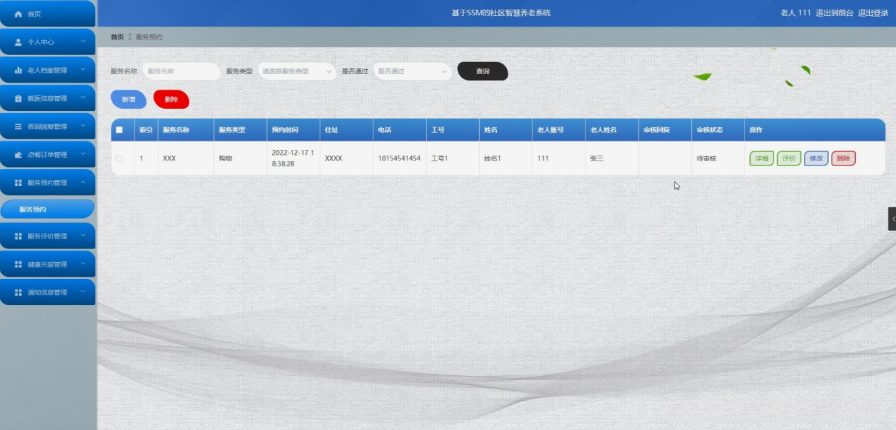 老年用户通过平台完成服务预约管理流程。在该页面上,请您录入所需的信息:即日起至结束日期的服务名称及类型;查询状态的选择项;以及是否需要新增或删除相关服务项;随后,请根据具体需求对各项详情内容执行编辑、评论等操作。(参考图5-8)