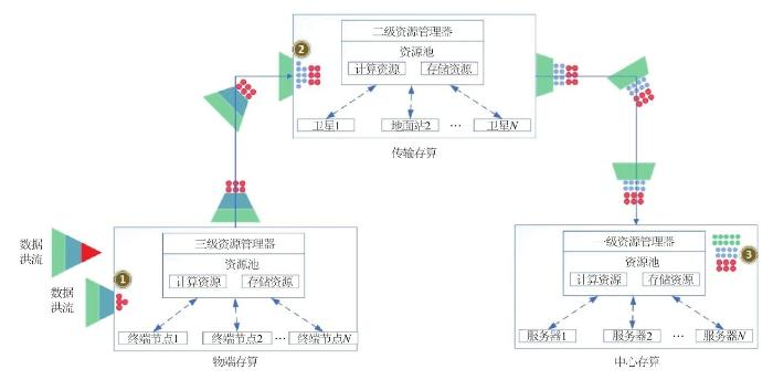 针对此,卫星互联网的物理实体、孪生体以及建模过程均面临着数据流量激增及存储资源的海量需求。本文提出构建“三级池化分流”的存算架构方案,如图4所示。