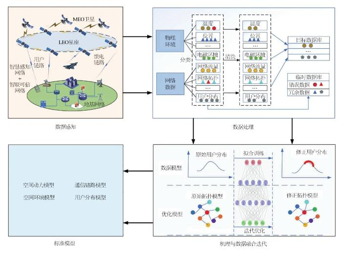 模型基于物理规律或数学表达式的存在,被划分为机理模型和数据模型两大类。其中,卫星互联网的空间动力模型和通信链路模型等属于机理模型范畴,这些模型可通过数学定理或物理公式进行精确描述;而网络实时状态和环境实时情况等则属于数据模型的范畴,主要依赖感知系统进行数据统计和反馈机制。卫星互联网的空间环境具有复杂性、用户业务分布不均衡以及系统时变性等特点,单一采用机理模型或数据模型进行建模难以充分满足日益复杂的系统特征需求。通过融合大规模数据与机理模型的双重驱动机制,一方面能够对感知数据进行偏差校正,另一方面通过机理模型的迭代演进过程,最终形成一套标准化的模型体系,其中包括用户分布模型、业务分布模型、资源分配模型以及网络路由模型等基础模型。基于标准化模型构建的孪生系统不仅能够实现对系统状态的高保真还原,还能够对未来系统的运行行为进行预测和推演。机理与数据双驱动的标准化模型构建流程如图3所示。